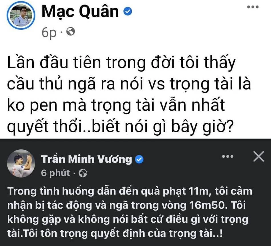 Không lâu sau thì tiền đạo Mạc Hồng Quân của Bình Định đăng dòng trạng thái: “Lần đầu tiên trong đời tôi thấy cầu thủ ngã ra nói với trọng tài là không pen mà trọng tài vẫn nhất quyết thổi… Nói gì bây giờ?