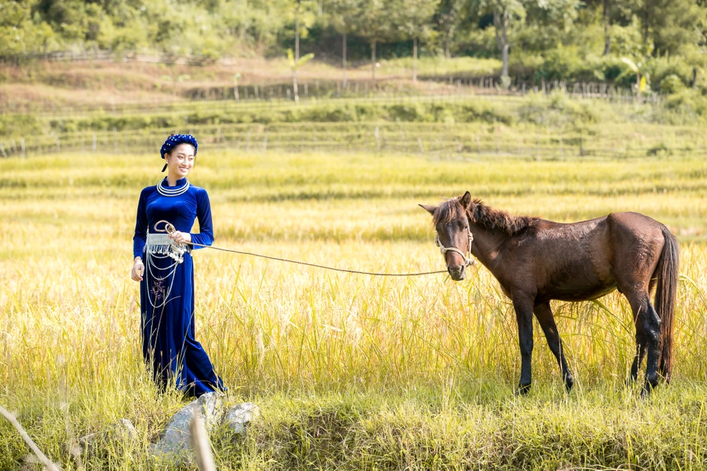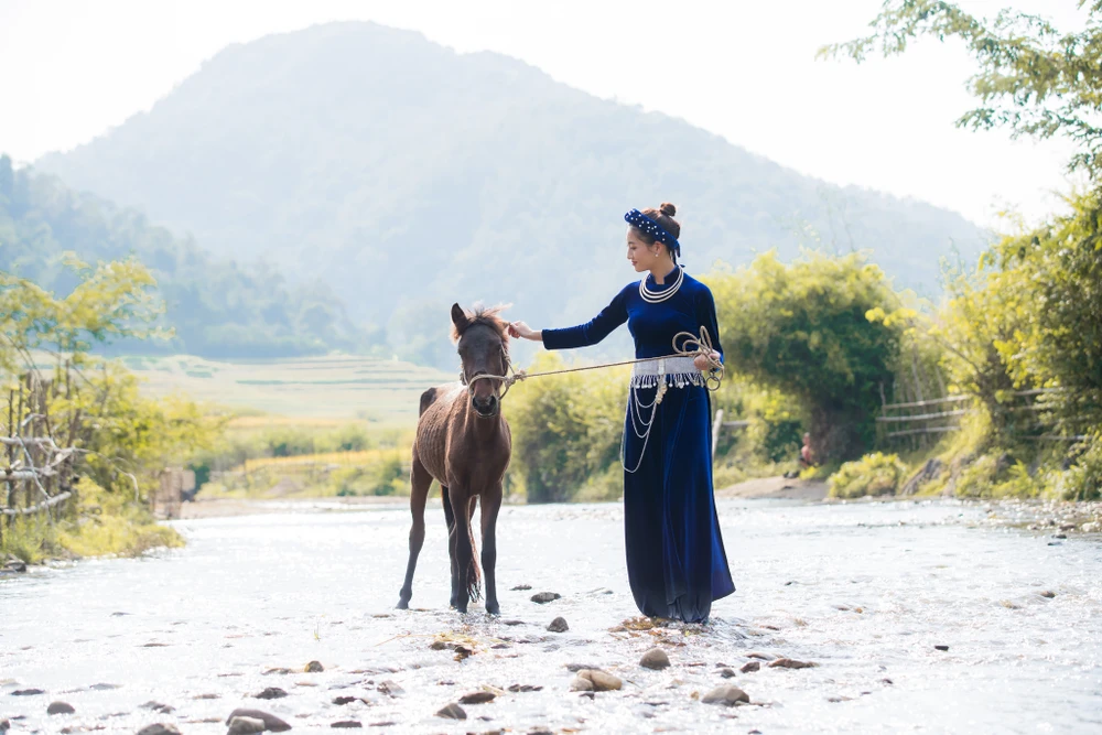 Nàng hậu gây ấn tượng khi hóa thân thành thiếu nữ người Tày xinh đẹp, mang những nét văn hóa đặc sắc của Cao Bằng nói riêng và Việt Nam nói chung giới thiệu đến bạn bè quốc tế.