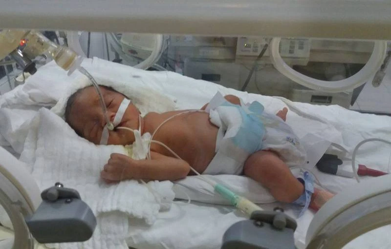 Em bé chào đời với cân nặng 1,6 kg. Tuy nhiên, do bé còn non tháng, trong khi mẹ phải gây mê nên khi chào đời bé không khóc và tím tái. Đoán định trước điều này, kíp bác sĩ hồi sức nhi của BV Phụ sản Trung ương sẵn sàng ngay tại phòng mổ tiến hành hành hồi sức cho cháu bé. Nhưng một tín hiệu đáng mừng là các thông số máy đang giảm dần. Bé sẽ được “cai” máy thở sớm trong những ngày tới. BS Đinh Phương Anh, người trực tiếp điều trị cho cháu bé, cho biết hiện giờ cháu đang được điều trị kháng sinh.
