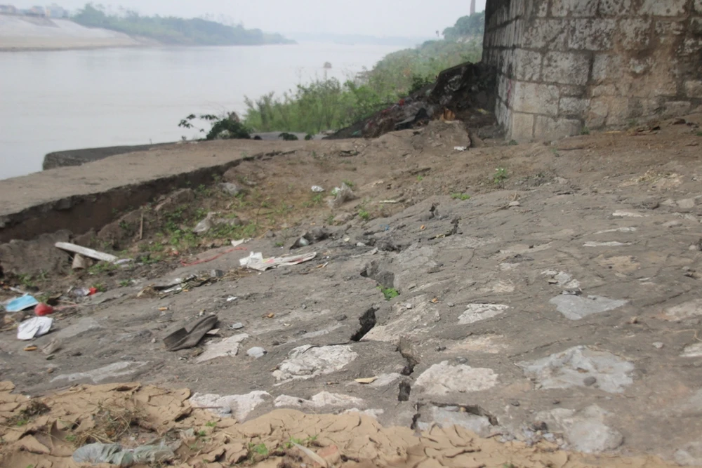 Vết nứt chạy dài từ mố cầu xuống tận khu vực tiếp giáp với mặt sông.