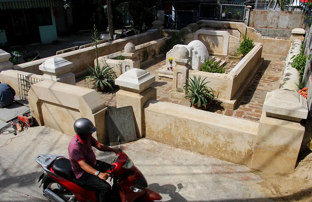 Bia sau mộ nằm sát nhà dân, ngôi mộ được bao quanh bởi hai vòng tường.