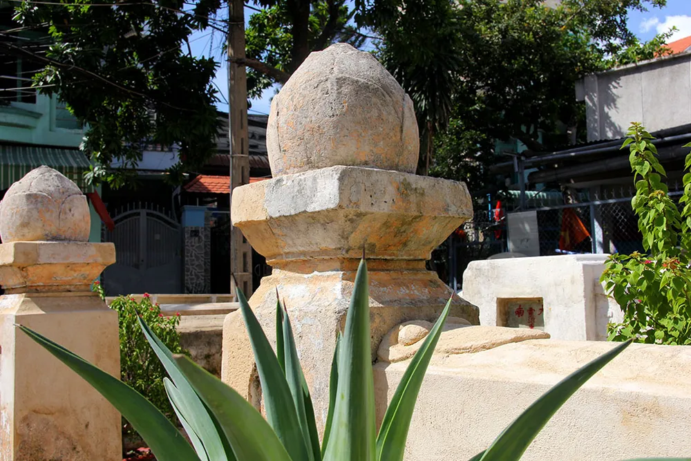 Cửa mộ có hai trụ gắn vào tường bao. Trên đầu cột trụ có chạm búp sen.