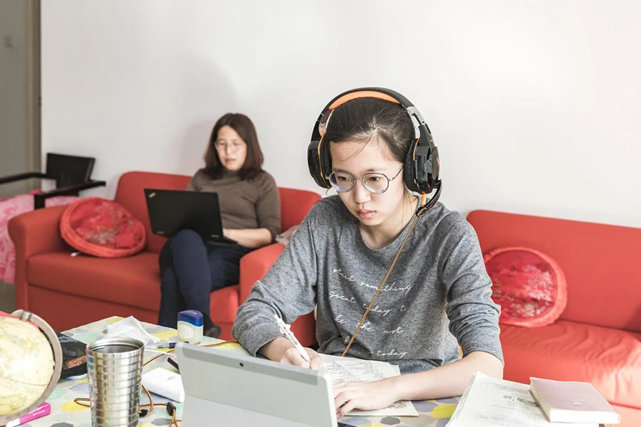 Một học sinh Trung Quốc học online, còn mẹ làm việc ở nhà trong đại dịch.