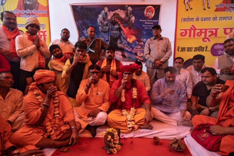 Ông Chakrapani Maharaj, người đứng đầu Akhil Bharat Hindu Mahasabha, đã làm mẫu chụp ảnh khi ông đặt một chiếc thìa chứa đầy nước tiểu bò gần bề mặt một bức biếm họa virus SARS-CoV-2.