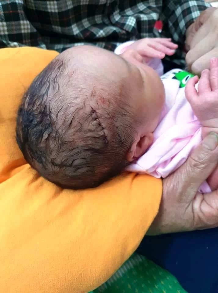Người thân tiếp nhận cháu bé và hốt hoảng khi thấy bé vừa lọt lòng đã bị khâu sáu mũi trên đầu.