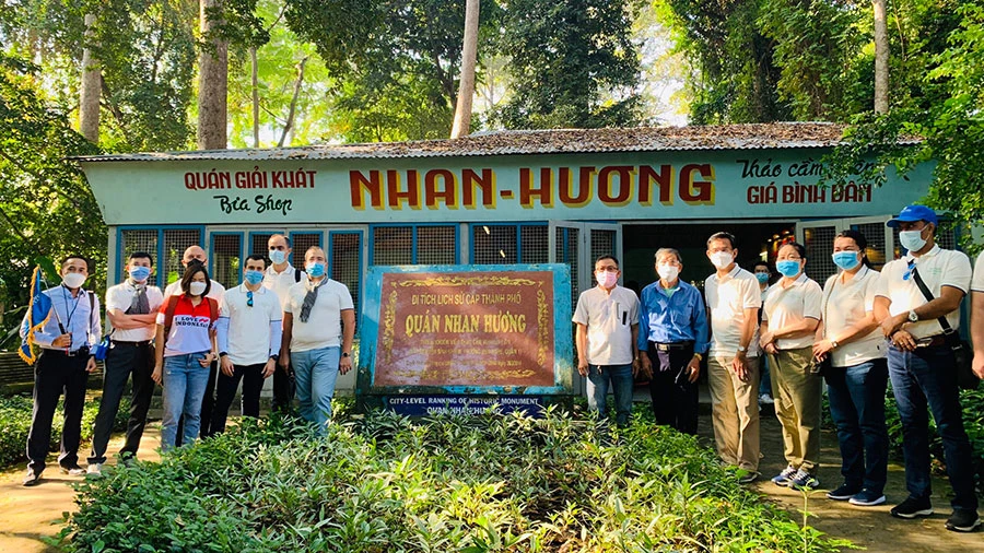 Đoàn khách báo chí nước ngoài tham quan city tour Biệt động Sài Gòn đầu tháng 12-2021. Ảnh: NGUYỄN CHI