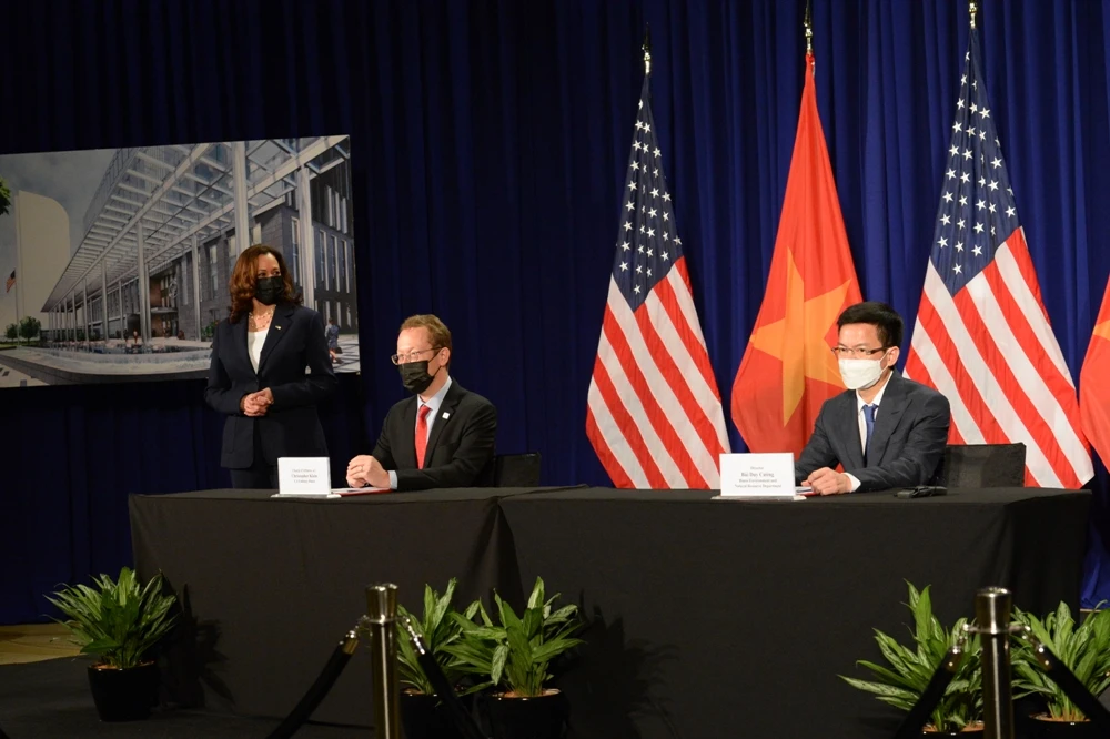 Đại biện lâm thời Mỹ cùng Giám đốc Sở Tài nguyên và Môi trường Hà Nội ký thỏa thuận thuê đất. Ảnh: ĐSQ Mỹ