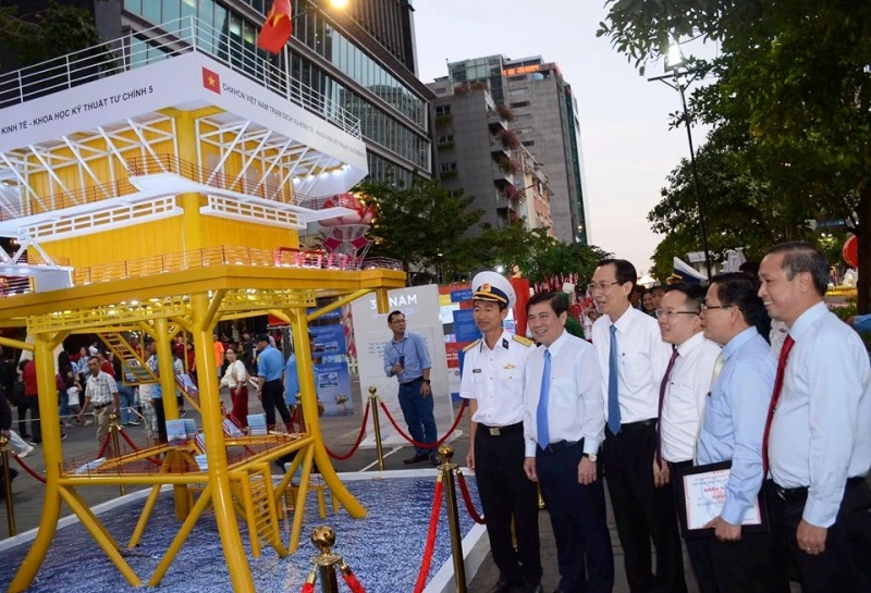 Lãnh đạo TP.HCM xem mô hình Nhà giàn. Ảnh: HỒ LONG