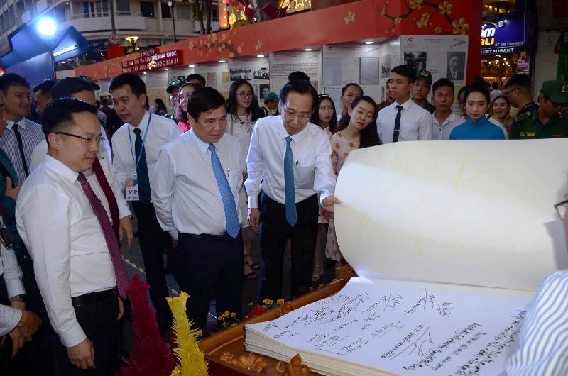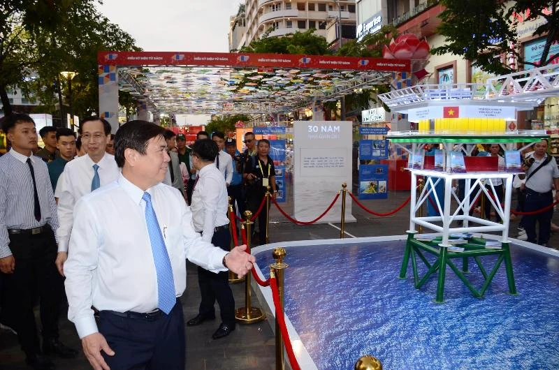 Chủ tịch UBND TP Nguyễn Thành Phong cùng các lãnh đạo xem một cuốn sách. Ảnh: HỒ LONG