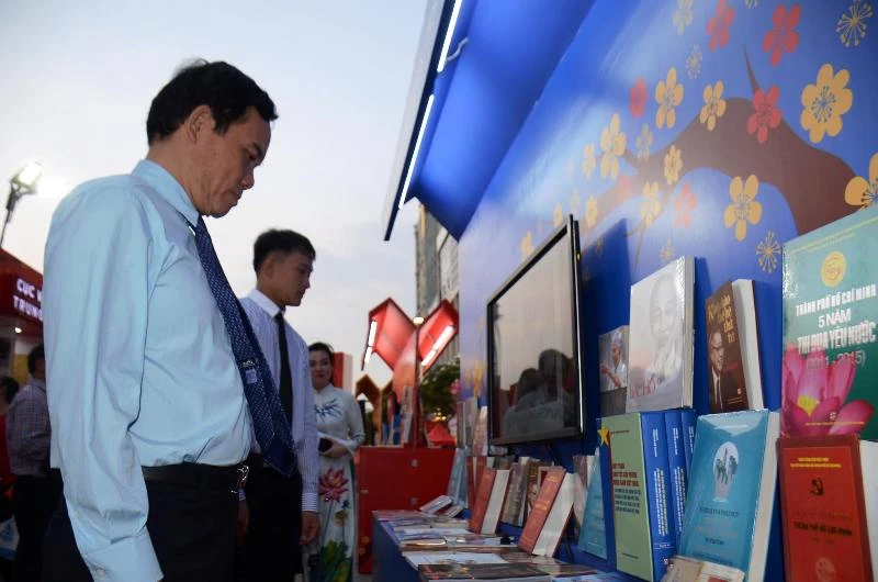 Phó Bí thư Thường trực Thành ủy Trần Lưu Quang đang xem các cuốn sách. Ảnh: HỒ LONG