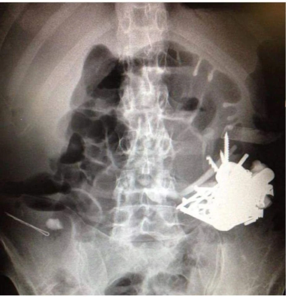 Lần đầu tiên bệnh nhân này phải nhập viện vì nghẽn dạ dày vào tháng 5-2012. Các mảnh kim loại tích tụ đã cản trở đường tiêu hóa và khối tắc nghẽn được điều trị bằng biện pháp thông ống.