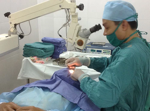 Bác sĩ bệnh viện STO-Phương Đông đang mổ cườm cho bệnh nhân nghèo. Ảnh: TRẦN NGỌC