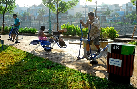 Môi trường sống của người dân ngày càng được cải thiện. Trong ảnh: Người dân tập thể dục buổi sáng trên đường ven kênh Tân Hóa-Lò Gốm mới được cải tạo xây dựng. Ảnh: HTD