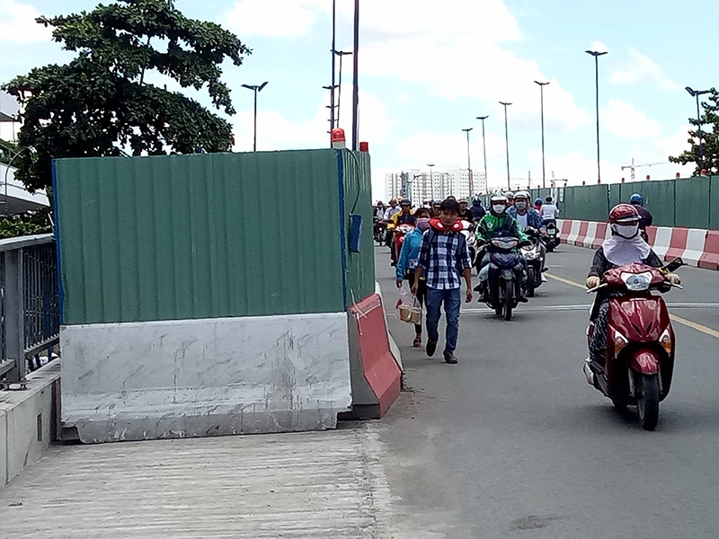 Chung cảnh ngộ, anh Đào Anh Dũng, quê Tiền Giang, vừa dắt tay vợ tránh xe đi qua đoạn rào chắn để xuống dốc cầu Chữ Y (cũng nối quận 5 với quận 8) chia sẻ: “Đúng là rất nguy hiểm khi phải đi chung với xe cộ thế này, lại là xe đang xuống dốc cầu với tốc độ cao. Như anh thấy đó, không còn đường nào để đi cả”.