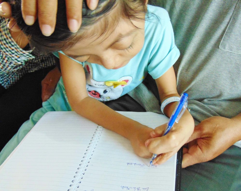 Bé Minh Anh đã cầm được bút sau khi phẫu thuật bàn tay trái. Ảnh: TRẦN NGỌC