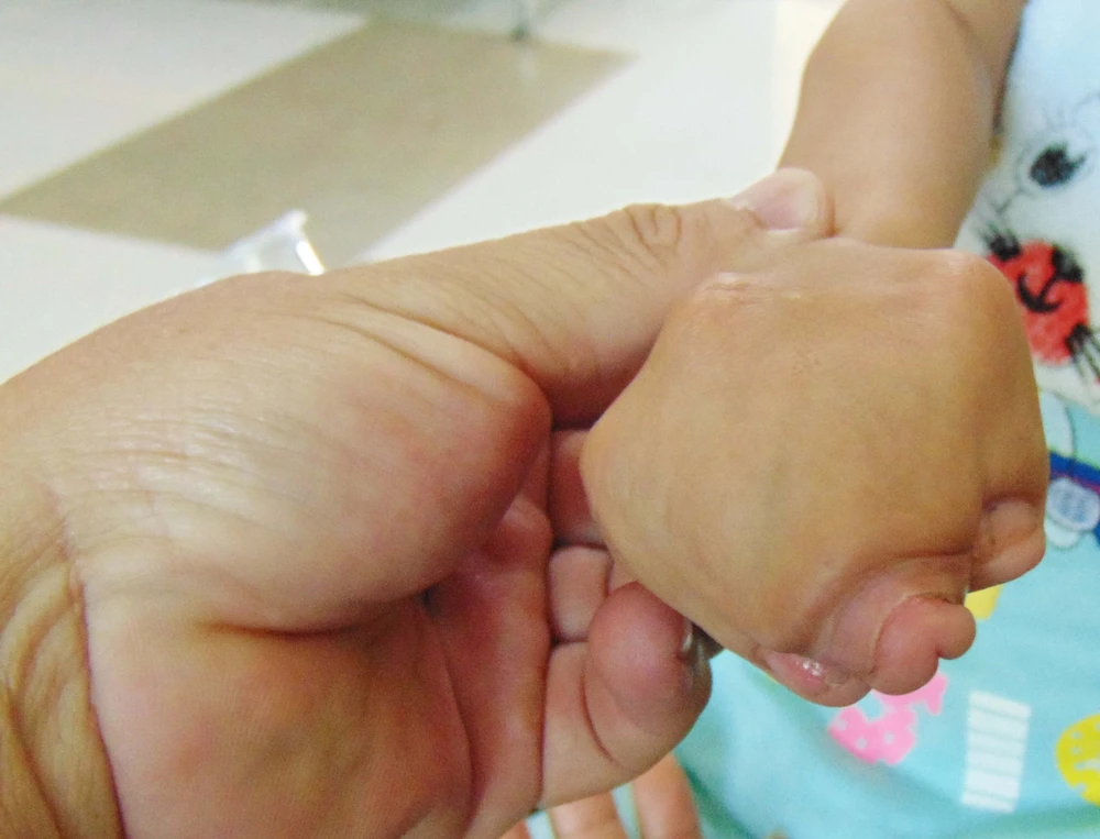 Năm ngón bàn tay phải của bé Minh Anh dính chặt nhau. Ảnh: TRẦN NGỌC
