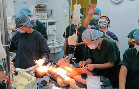 Ông Lê Thanh Hải, Giám đốc BV Nhi Trung ương, cho biết hai cháu bé chung một phần bụng và nửa trước lồng ngực. Phần dính bên ngoài tương đối lớn với diện tích vạt da chiếm khoảng 10% diện tích cơ thể, bộ phận khó nhất là gan thì dính phần bao gan và một phần nhu mô gan. “Để chuẩn bị cho ca mổ, chúng tôi đã đặt túi giãn da, mục đích là có da đủ để che phủ vết thương sau khi mổ” - ông Hải nói.