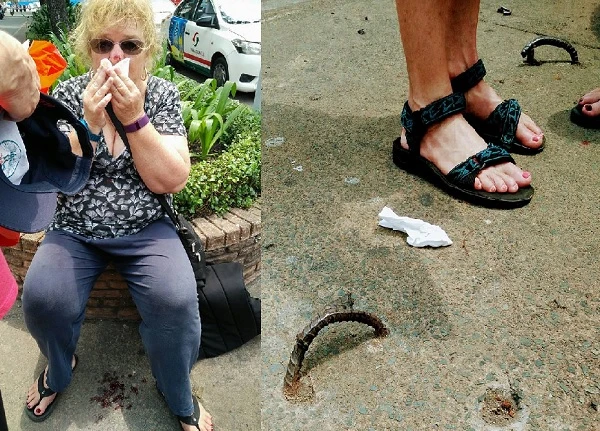 Vị khách Tây bị vấp té chảy máu do vướng móc sắt. Ảnh: TUYẾT ÂN
