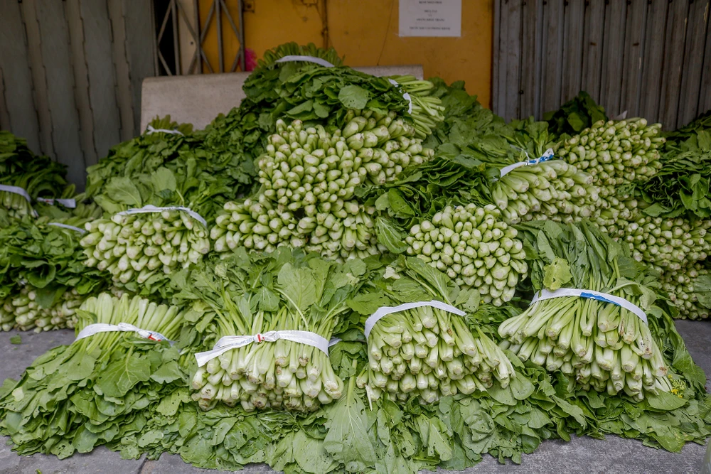 Ngoài các tình nguyện viên, những người dân lân cận cũng xoắn tay áo phụ giúp nhóm bó rau, lặt lá hư.