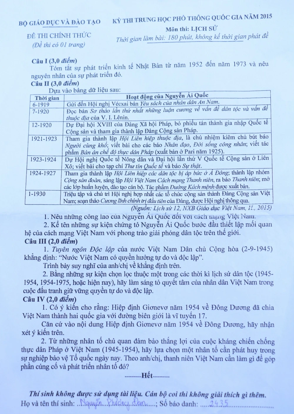 Gợi ý bài giải đề thi môn Lịch sử do trung tâm Vĩnh Viễn thực hiện, mời bạn đọc xem tại đây