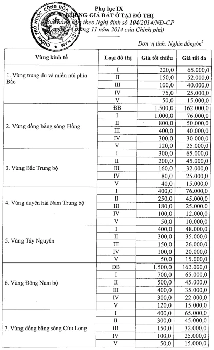 Cụ thể, nghị định 104/2013/NĐ-CP quy định khung giá đất ở tại đô thị tối đa dao động từ 10 triệu đồng/m2 đến 162 triệu đồng/m2 (cao hơn mức giá hiện hành 2,4 lần) trong đó, mức giá cao nhất 162 triệu đồng/m2 được áp dụng với các đô thị loại đặc biệt tại Vùng đồng bằng sông Hồng và Vùng Đông Nam Bộ, gồm các tỉnh, thành phố trực thuộc Trung ương như Vĩnh Phúc, Bắc Ninh, Hải Phòng, Hà Nội, Nam Định, TP.HCM, Đồng Nai, Bà Rịa - Vũng Tàu...; mức giá đất ở thấp nhất tối đa là 10 triệu đồng/m2 được áp dụng với các đô thị loại V tại Vùng Bắc Trung Bộ, gồm các tỉnh Thanh Hóa, Nghệ An, Hà Tĩnh, Quảng Bình, Quảng Trị và Thừa Thiên Huế (bảng phụ lục IX)