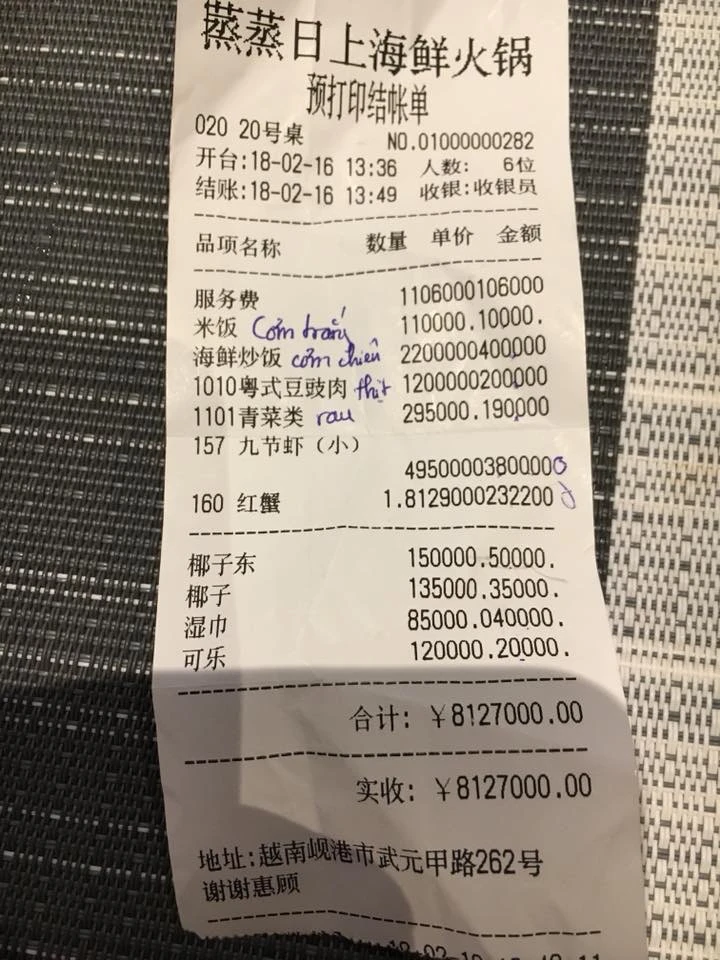 Hóa đơn tính tiền được xuất bằng tiếng Trung Quốc.