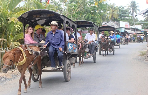 Khách nước ngoài thăm làng quê bằng xe ngựa ở Bến Tre.