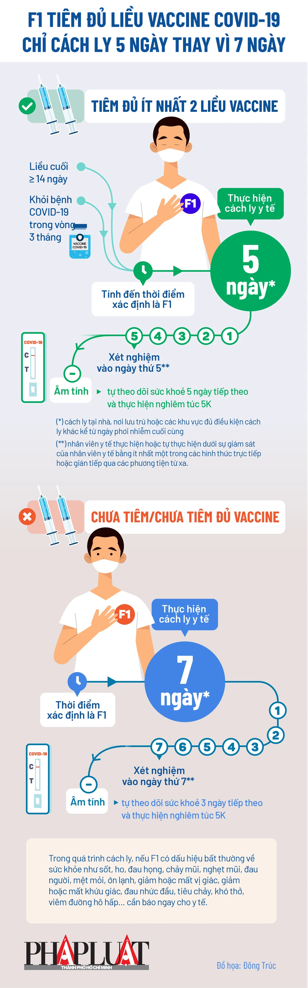(PLO)-Theo Công văn số 762 Thứ trưởng Bộ Y tế Nguyễn Trường Sơn ký chiều 21-2, các F1 đã tiêm đủ liều vaccine COVID-19 chỉ cần cách ly 5 ngày thay vì 7 ngày như trước. Công văn này thay thế cho công văn 10696/BYT-MT ngày 16-12-2021 của Bộ Y tế về cách ly y tế đối với F1 đã tiêm đủ liều vaccine hoặc đã khỏi bệnh COVID-19.