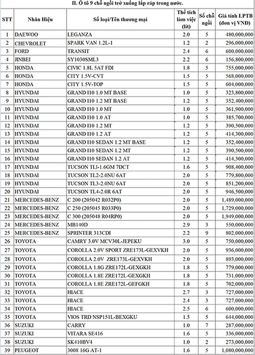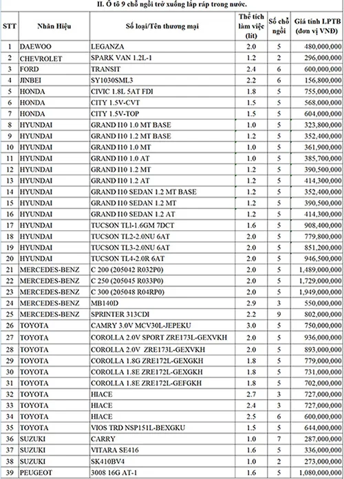 Bảng phí trước bạ theo một số loại ô tô, xe máy: