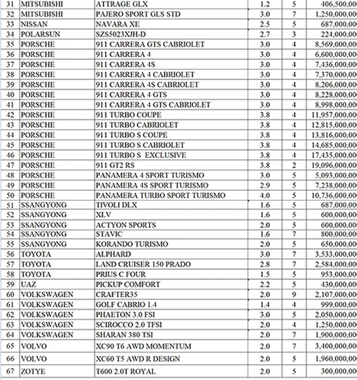 Đáng chú ý, trong danh sách này, xe Lamborghini Aventador S, hai chỗ ngồi có giá lên đến 40 tỉ đồng; xe Porsche thuộc dòng 911 có giá tính lệ phí trước bạ từ 6,6 đến 19 tỉ đồng; Lexus hơn 5 tỉ đồng...