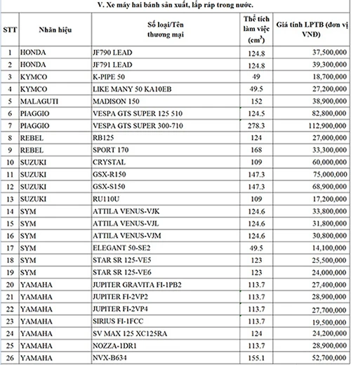 Mẫu xe máy có giá tính phí trước bạ cao nhất là Harley-Davidson CVO Street Glide có giá 1,605 tỉ đồng. Honda Lead có giá từ 37,5 đến 39,3 triệu đồng...