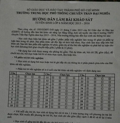 Trường THPT Chuyên Trần Đại Nghĩa vừa ra thông báo hướng dẫn HS làm bài khảo sát bằng tiếng Anh vào lớp 6. Các em sẽ dự khảo sát vào 8 giờ sáng ngày 20-6.