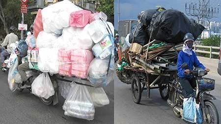 Tương tự, chiều 3-6, trên cầu Rạch Đỉa 2 (huyện Nhà Bè, TP.HCM) cũng có phụ nữ chạy xe máy lôi một xe ba gác chở nhiều bao hàng chất cao nhưng ràng buộc hời hợt (ảnh phải). Người đi đường ai cũng lo lắng vì những kiểu chở hàng như thế này rất nguy hiểm, bao hàng có thể rơi xuống gây tai nạn bất kỳ lúc nào.