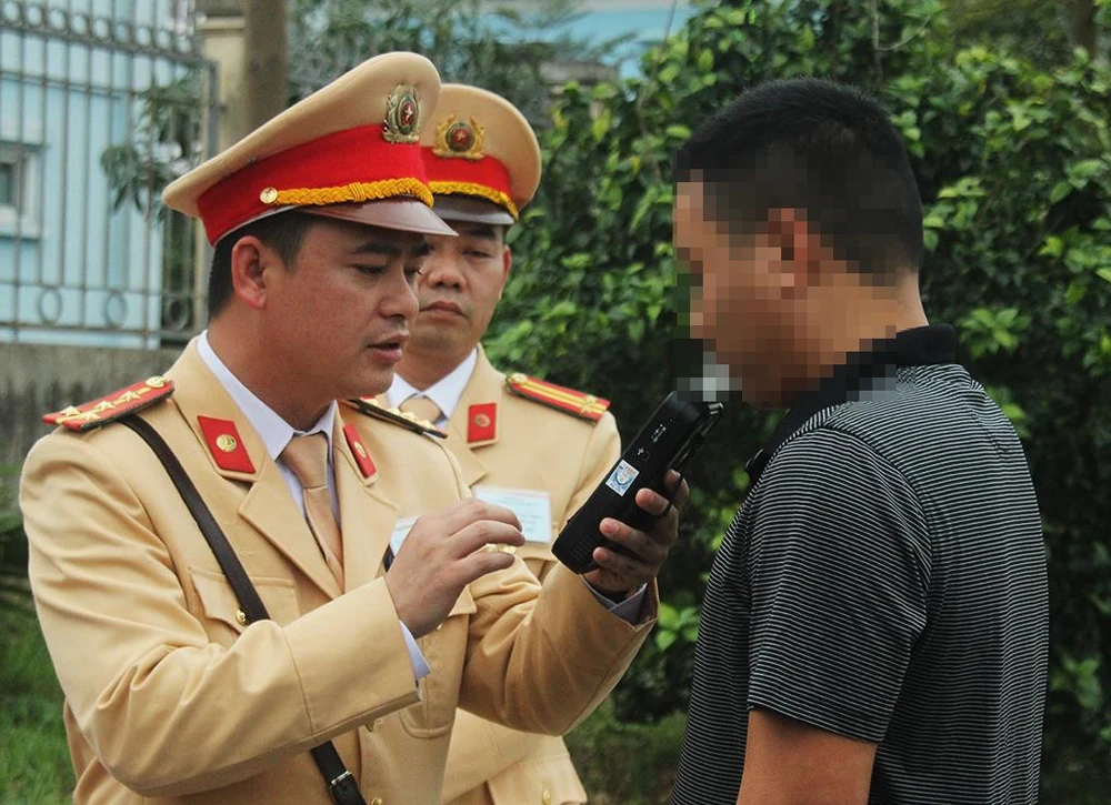 CSGT kiểm tra nồng độ cồn của một tài xế. Ảnh: TUYẾN PHAN