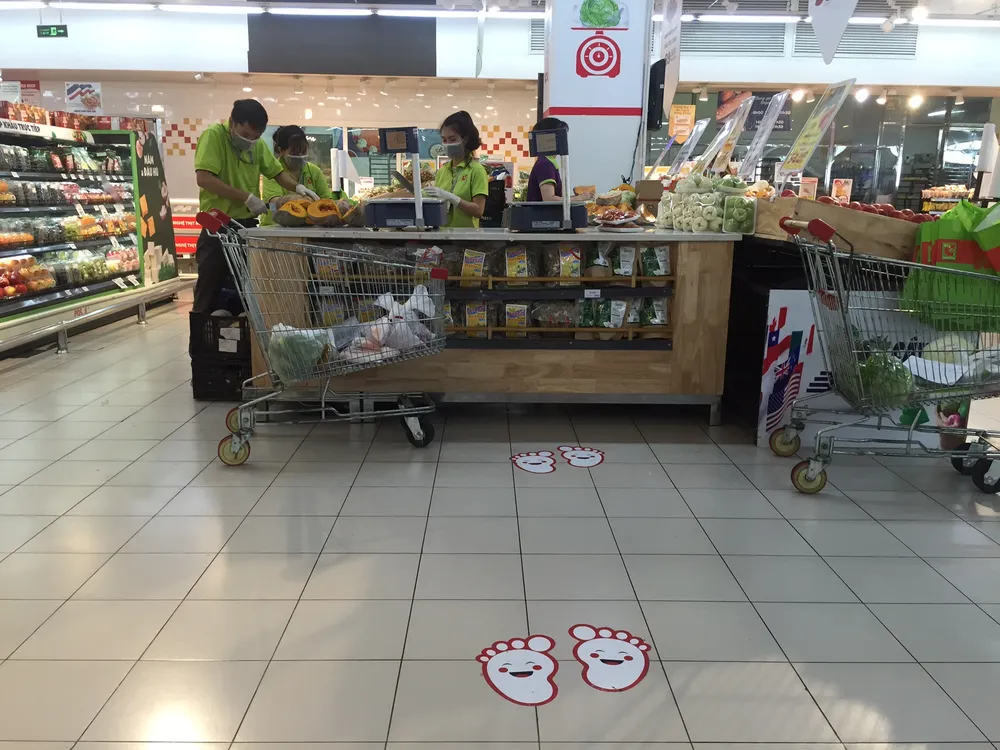 Xung quanh khu vực hàng tươi sống trong siêu thị có hình ảnh hướng dẫn giữ vị trí an toàn