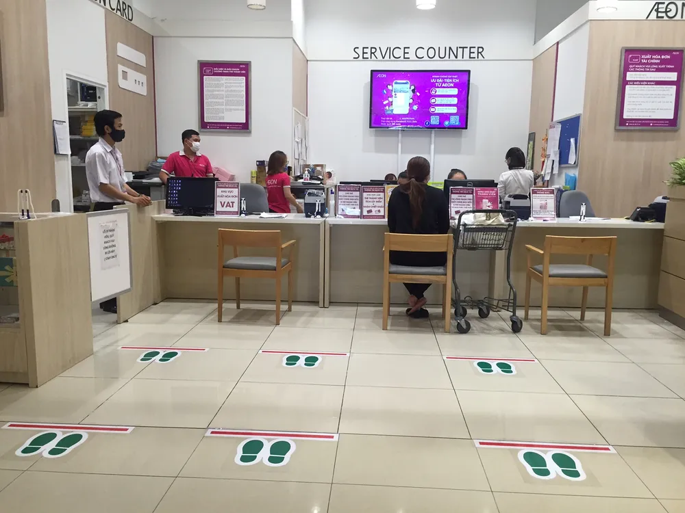 Khu vực dịch vụ khách hàng Aeon Celadon in hình đôi bàn chân hướng dẫn người dân chờ vị trí này