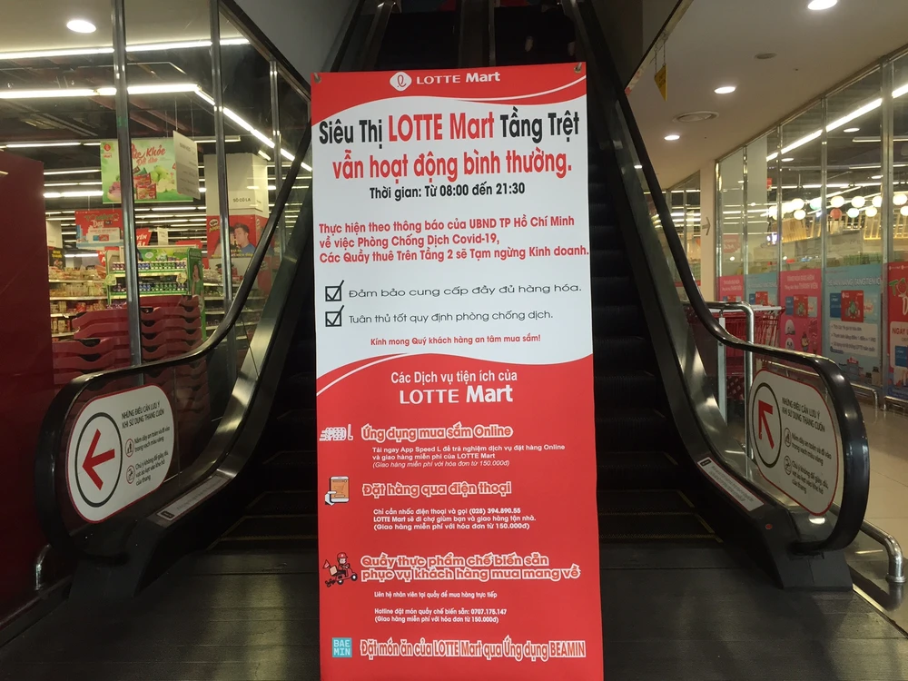 Tương tự tại Lotte Mart quận Tân Bình thông báo: Thực hiện theo thông báo của UBND TP.HCM về việc phòng, chống dịch COVID-19, các quầy thuê trên tầng hai sẽ tạm ngừng kinh doanh. Riêng Siêu thị Lotte Mart tầng trệt vẫn hoạt động bình thường từ 8 giờ sáng đến 21 giờ 30. Siêu thị đảm bảo cung cấp đầy đủ hàng hóa, khách hàng yên tâm mua sắm.