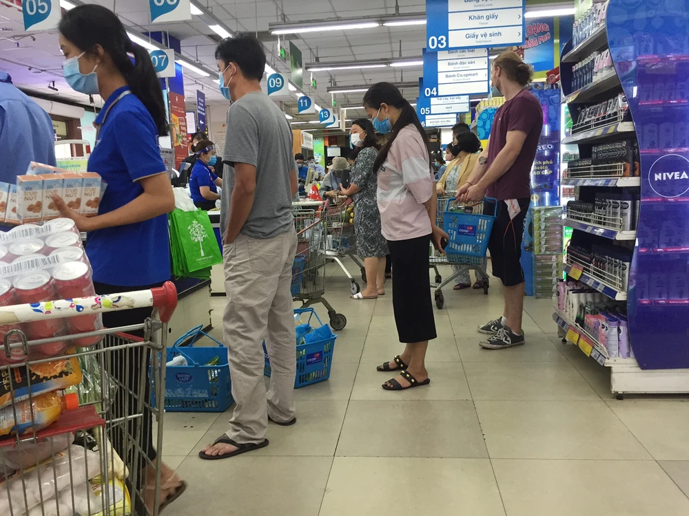 Siêu thị Co.opmart Nhiêu Lộc phát loa khuyến cáo người dân đứng cách xa ít nhất 1 m khi tính tiền và tránh nói chuyện không cần thiết với người xung quanh
