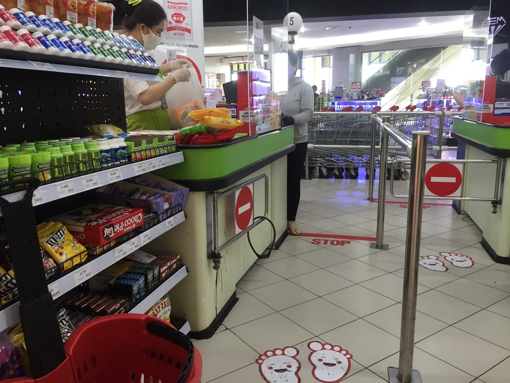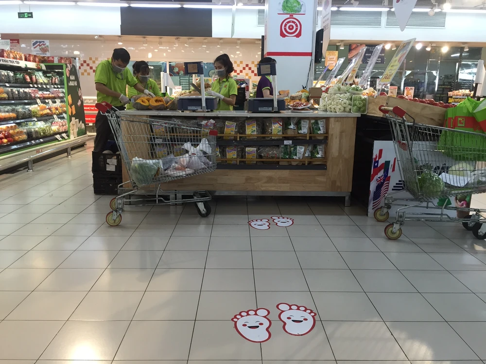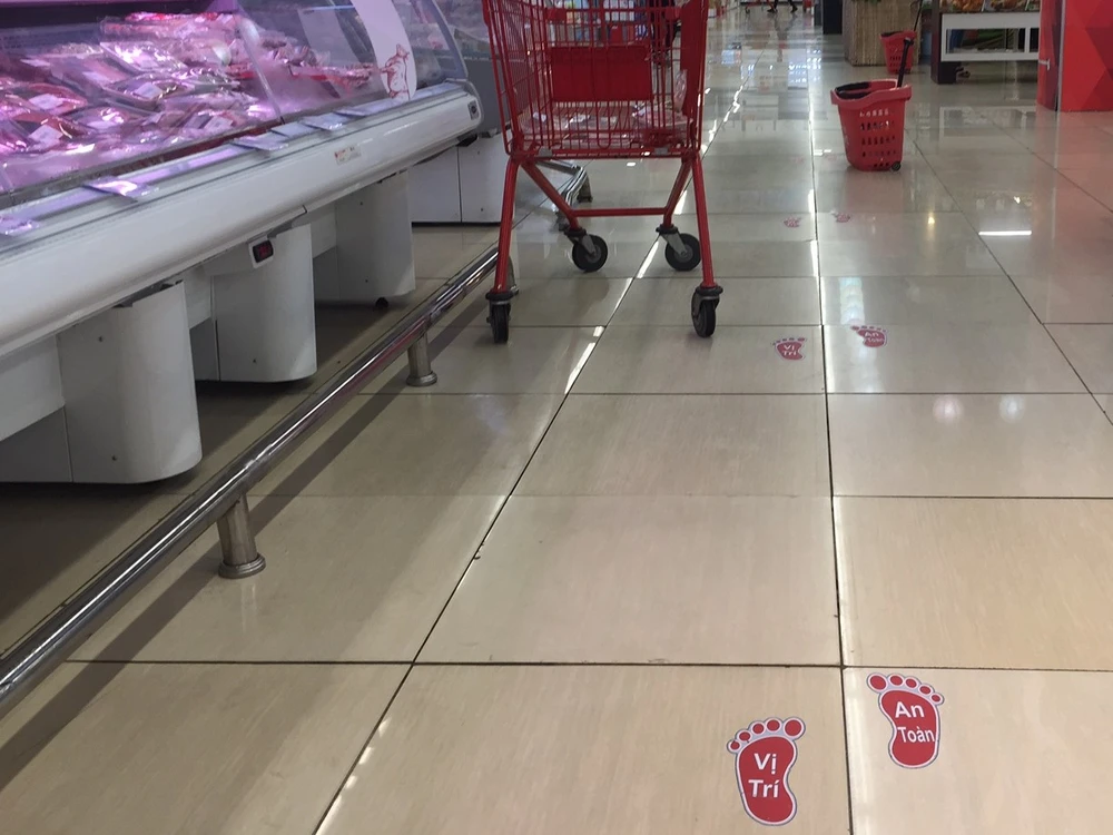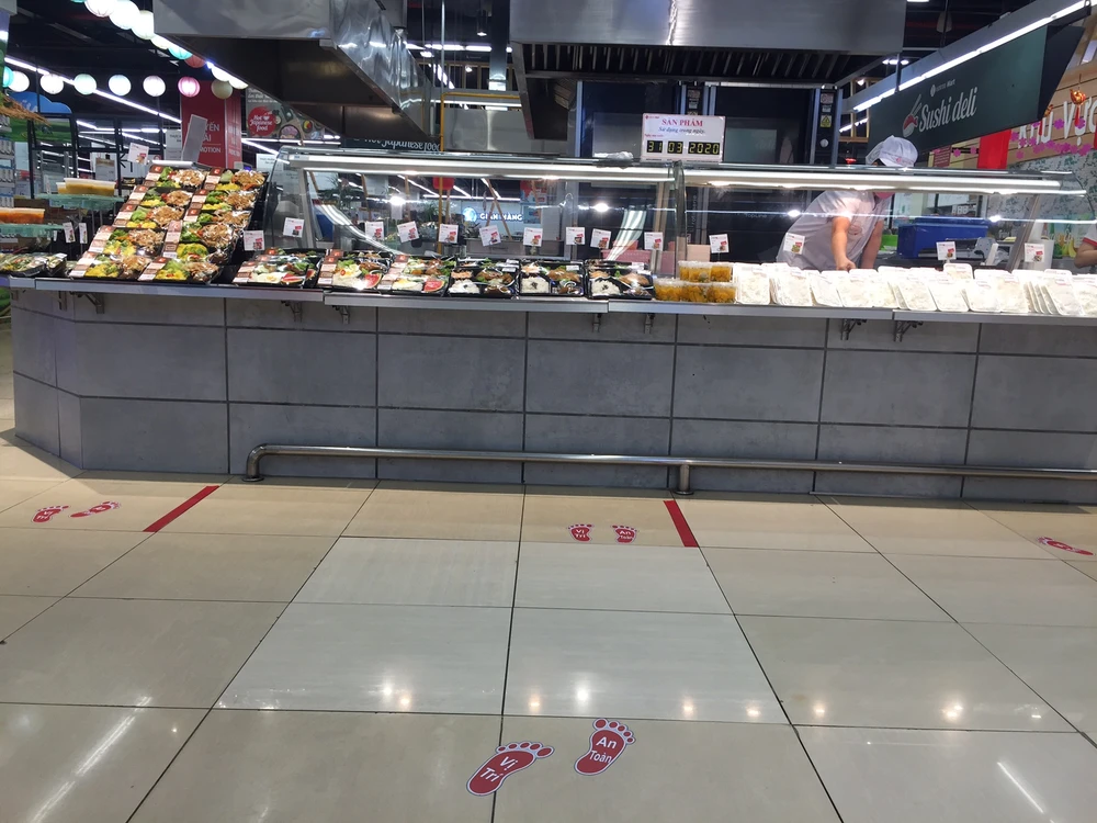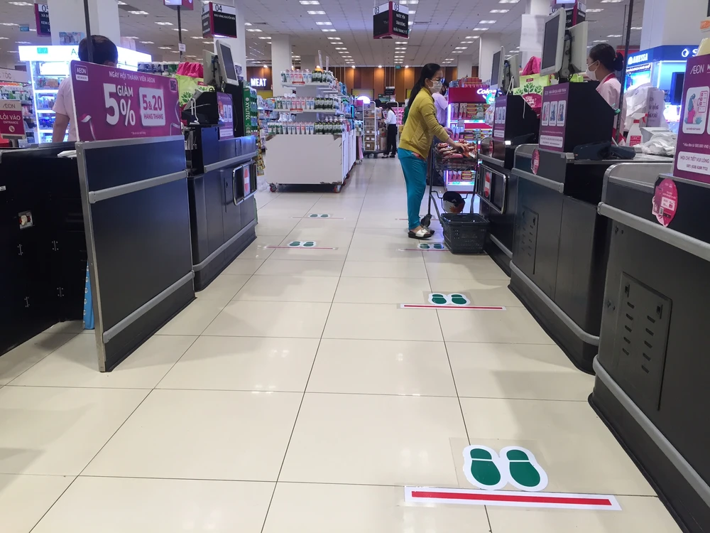 Đặc biệt, một số siêu thị Aeon Celadon, Lotte Mart , Big C Pandora... hướng dẫn người dân giữ khoảng cách an toàn khi mua sắm bằng việc đánh dấu vị trí bàn chân ở một số khu vực hàng thiết yếu, quầy tính tiền.