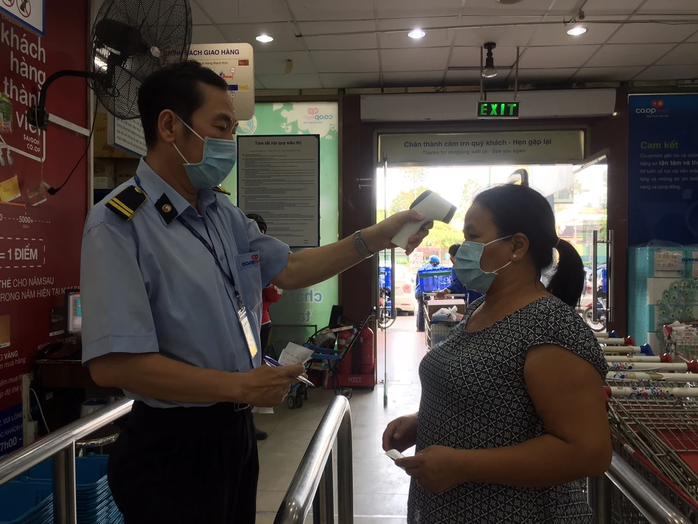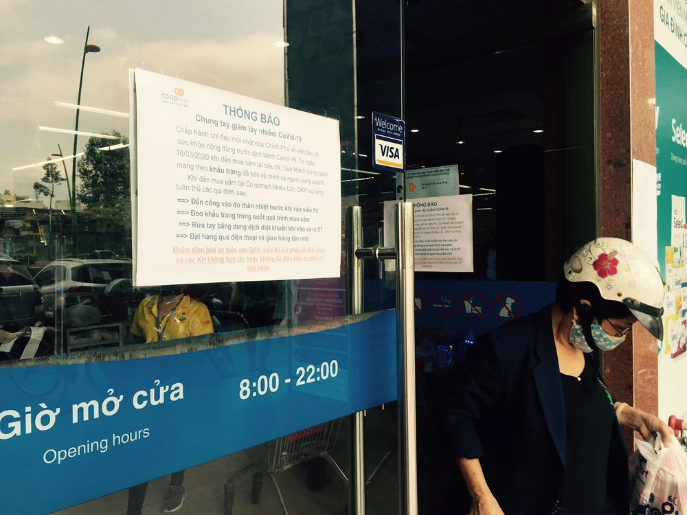 Ghi nhận tại các siêu thị trên địa bàn TP.HCM cho thấy ngoài thực hiện các biện pháp như đo thân nhiệt, rửa tay sát khuẩn, ngay cổng vào các siêu thị Co.opmart Nhiêu Lộc (quận 3), Big C Pandora (quận Tân Phú), Lotte Mart (Tân Bình) đều thông báo: Thực hiện theo chỉ đạo mới nhất của Chính phủ bảo vệ sức khỏe cộng đồng trước dịch COVID-19, từ ngày 16-3 yêu cầu người dân phải đeo khẩu trang khi đến mua sắm nơi công cộng.