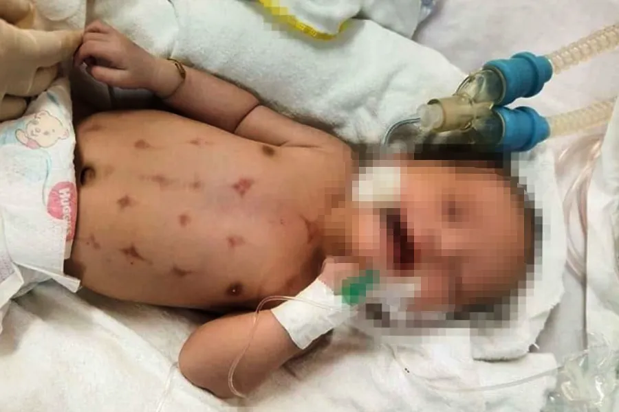 Bé H. được người thân bế đến Khoa Hồi sức cấp cứu Sơ sinh, BV Sản nhi Nghệ An trong tình trạng khó thở, tím tái, bú kém, ho nhiều, li bì. Kểm tra trên da của bé có nhiều mảng bầm tím, vết kim chích trên vùng ngực, bụng, cổ, lưng.