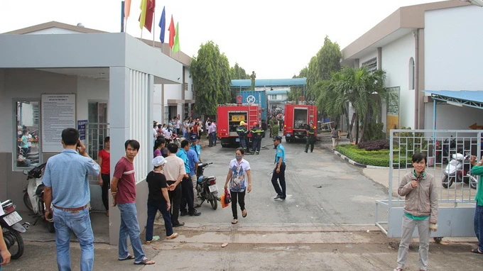 Nhận tin báo, Công an PCCC Đồng Nai điều động 5 xe chuyên dụng và hơn 40 cán bộ chiến sĩ đến phong tỏa hiện trường. Ở nhánh khác, các lực lượng chữa cháy leo lên nóc nhà xưởng, phun nước dập lửa trên miệng ống thông gió.