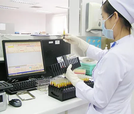 Nhân viên BV Truyền máu và Huyết học TP.HCM đang xét nghiệm sàng lọc máu hiến. Ảnh: TRẦN NGỌC
