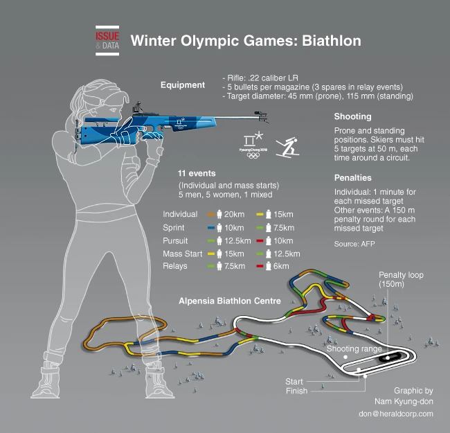 Trên cung đường quy định, các VĐV tiến hành xuất phát là trên lưng mang khẩu súng. Ở Olympic mùa đông Pyeongchang này Biathlon có cả thảy 11 nội dung thi tài gồm năm nội dung, năm nội dung nữ và một nội dung đôi nam-nữ.