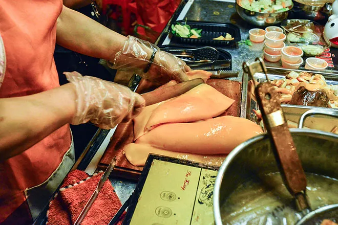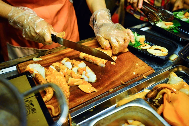 Con mực với màu vàng ruộm, nóng hổi và nhanh chóng được xe thành từng miếng nhỏ dưới nhát dao điêu luyện của người đầu bếp.