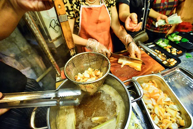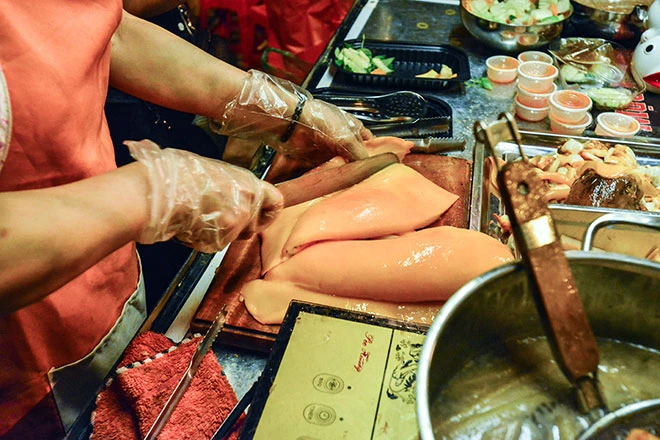 Từng miếng mực thơm ngon vàng ruộm được nấu trong những nồi nước dùng lớn. Một con mực lớn như vậy có thể phục vụ cho nhiều suất ăn.