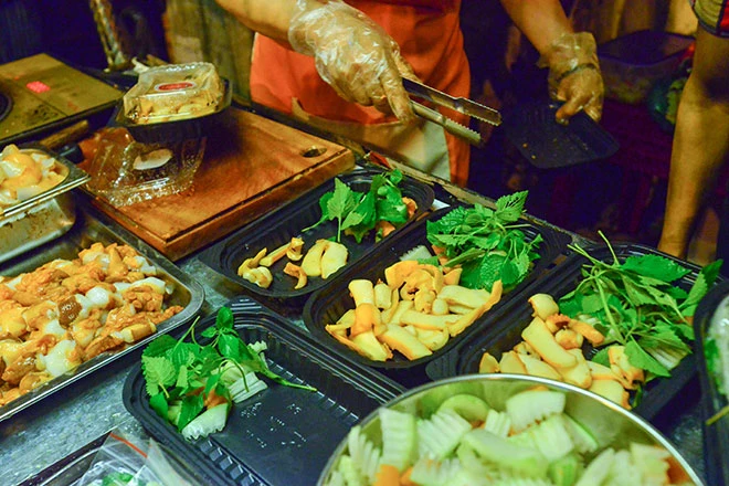 Từng miếng mực lớn được người bán gắp đầy vào bát nhựa rồi rưới nước sốt lên trên.