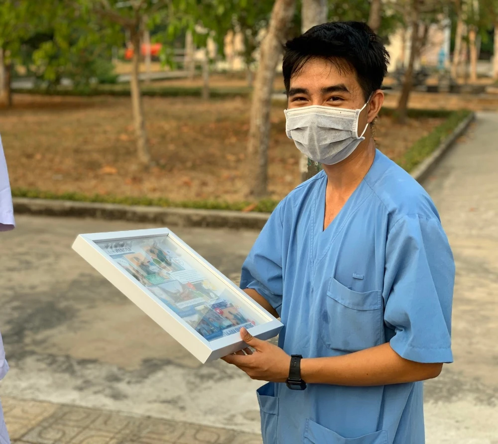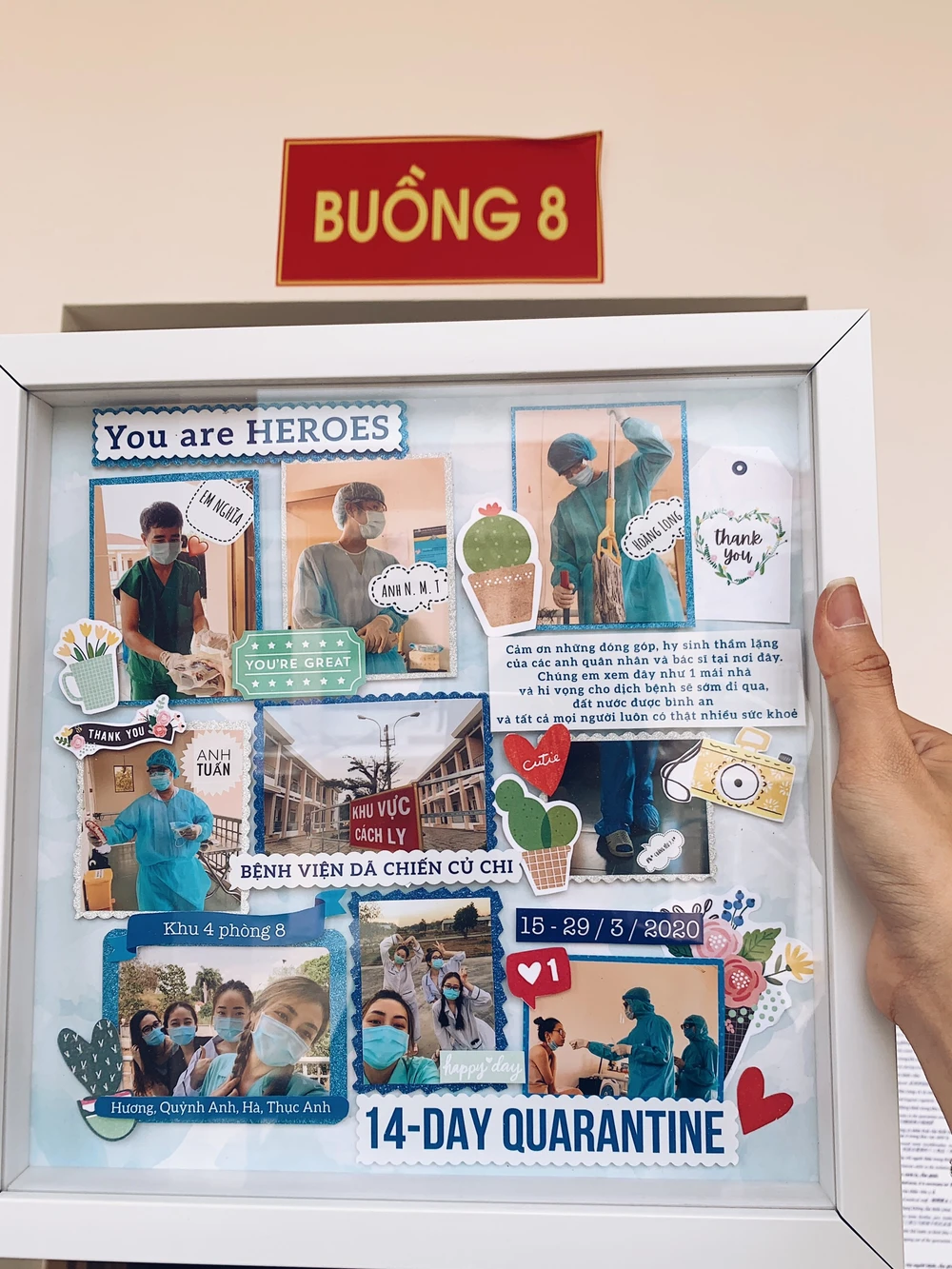 Thu Hương chia sẻ có ý định làm khung ảnh tặng các anh từ những ngày đầu vào khu cách ly nên canh một số khoảnh khắc làm việc của các anh chị để chụp lại làm kỷ niệm như người hộ lý, người giao cơm, người lau nhà, bác sĩ. Thu Hương cũng xin danh tính từng người để điền vào từng tấm ảnh, tuy nhiên cũng có bác sĩ chỉ cho biết tên viết tắt là NMT.