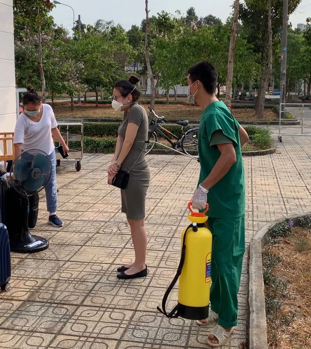 Người ở khu cách ly được xịt khử khuẩn trước khi ra về. Ảnh: NVCC
