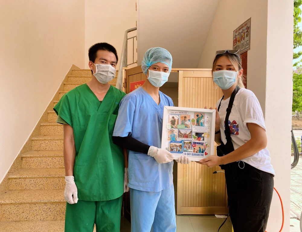 Thu Hương thay mặt phòng tặng khung ảnh kỷ niệm cho các nhân viên khu cách ly. Ảnh: NVCC